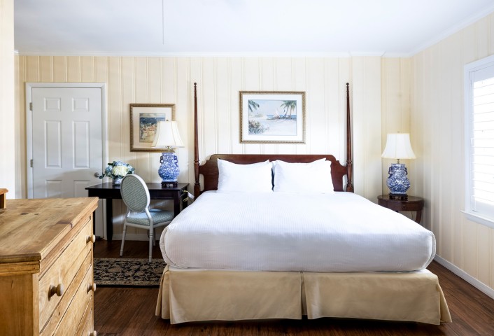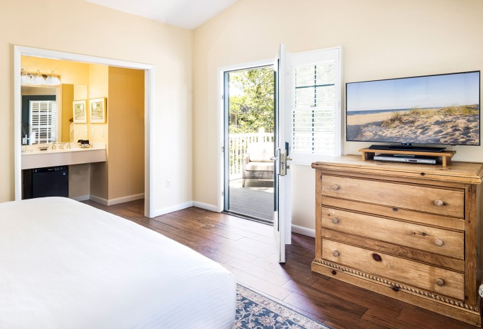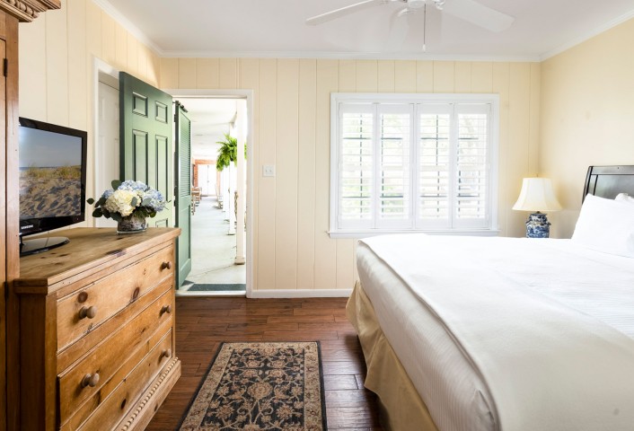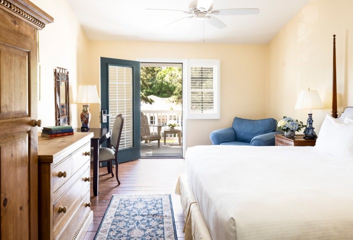 This spacious room features a king-size bed and a private sun deck overlooking the garden courtyard from the second floor of the Palmer House.