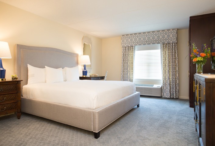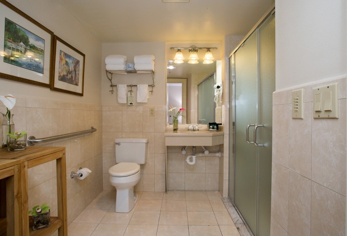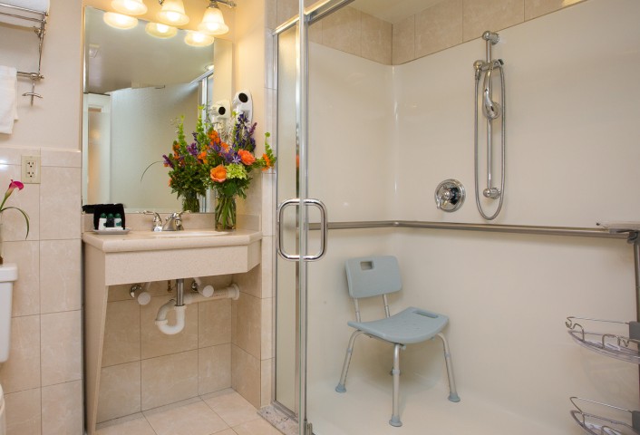 Everyone can get comfortable in ADA-compliant rooms with a king-size bed and a large bathroom featuring a roll-in shower with handrails.