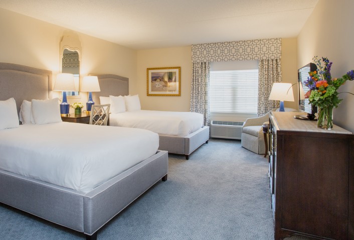Enjoy the convenience of two comfortable queen-size beds in a spacious room with an inviting sitting area and an elegant, oversized marble-tile bathroom.