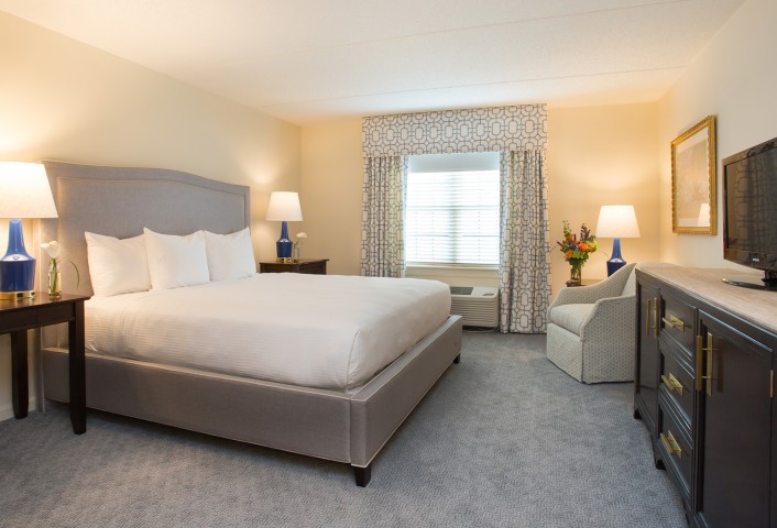 Relax in a generously sized room with a king-size bed and easy chair, where you can enjoy watching the latest HBO shows on a flat-screen TV.